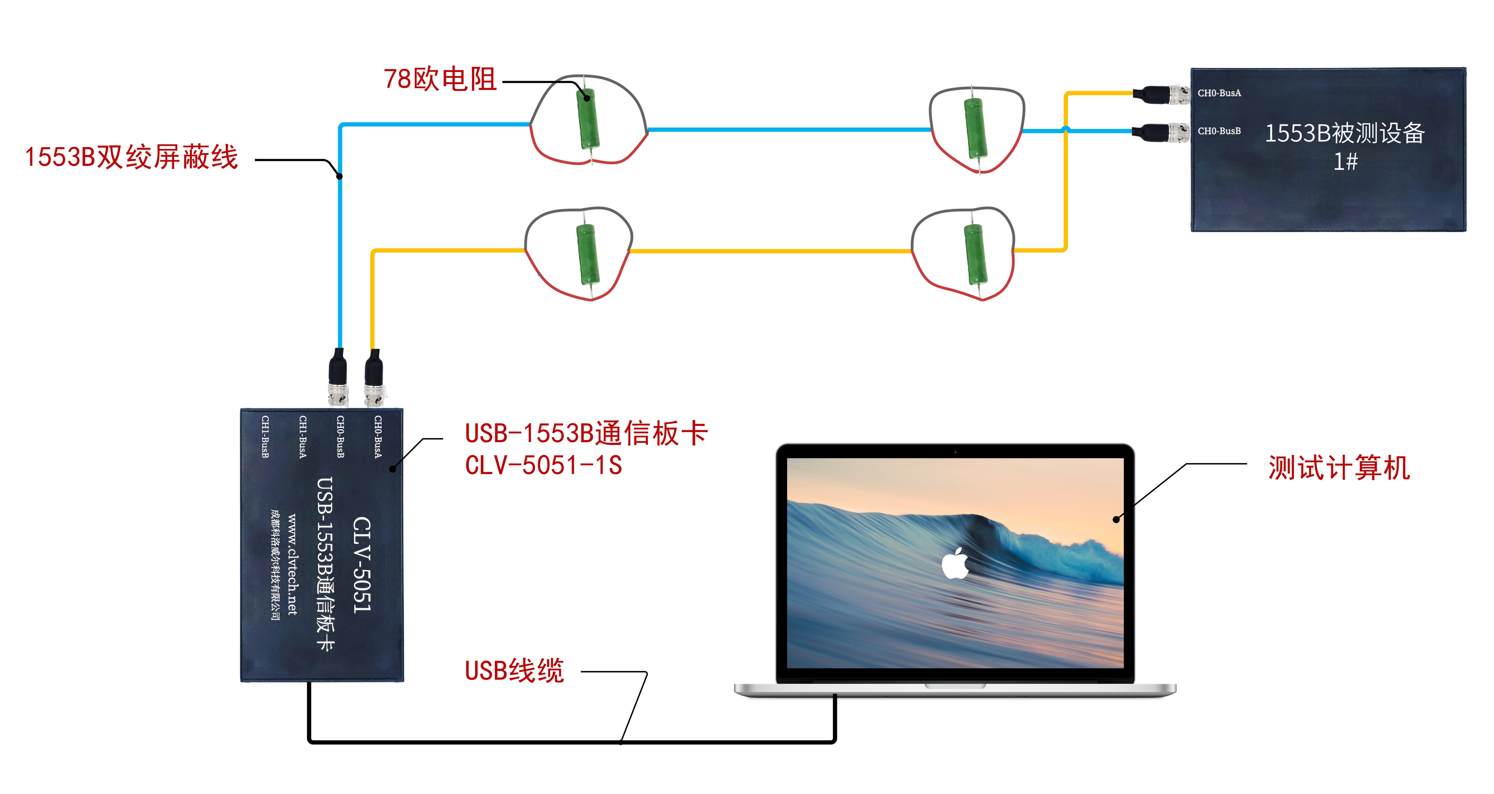 现需对4个被测设备(RT1,RT2,RT3,RT4)进行1553B组网测试。以两个科洛威尔USB-1553B单通道单功能通信板卡CLV-5051-1S(https://www.clvtech.net/page230?product_id=94)作为模拟设备,一个模拟BC,一个模拟BM,以完成应答激励,数据记录等测试任务。组网图如下: